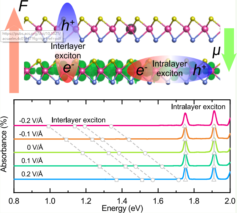 图1 上图:电场作用下,双层Janus MoSeS中的层间激子与层内激子示意图;下图:电场调控下双层Janus MoSeS光吸收谱。