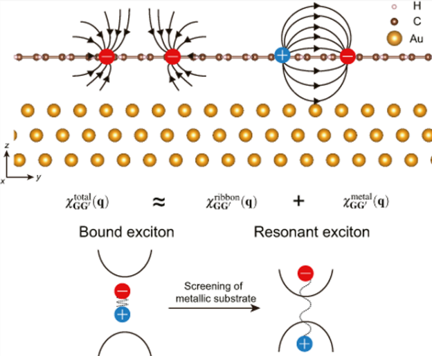 该研究针对近年来备受关注的双苯联纳米带,揭示了金属基底对其准粒子能带与激子效应的显著重整化作用。双苯联纳米带是一类新型的碳同素异形体,兼具石墨烯的高导电性和苯环结构的化学稳定性,在分子电子器件、量子材料设计等领域具有重要应用前景。然而,实验测得的带隙值与理论计算结果长期存在偏差,其关键原因之一即为金属基底(Au(111))所引入的复杂介电屏蔽效应。针对这一问题,研究团队基于密度泛函理论结合多体微扰理论,系统考虑了金属基底的附加介电屏蔽,定量刻画了其对准粒子能带与电子-空穴相互作用的调制机制。结果显示,金属基底的屏蔽效应不仅通过调节电子-空穴直接相互作用使激子结合能显著降低约1.2 eV,还通过调节电子-空穴交换作用进一步引起约0.3 eV的补偿效应,最终导致激子结合能整体下降约0.9 eV,并使得部分激子态从束缚态转变为共振态。