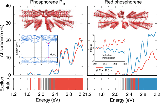 与人们熟知的黑磷、蓝磷相比,纤维状磷结构更加复杂,其内部由管状单元构成,具有独特的电子结构和光学各向异性。近年来,新型纤维状磷(如P₁₁与红磷)被实验成功合成,为探索厚层二维材料的光学响应与激子行为提供了新的研究契机。然而,这类体系的电子-空穴激发机制与光学响应特性仍缺乏系统性的理论认识。针对这一科学问题,研究团队基于多体微扰理论,深入分析了两种纤维状磷的准粒子能带结构、激子态分布与光学响应特征。该研究首次从理论层面系统揭示了二维纤维状磷同素异形体中电子-空穴激发与光学响应的本征差异,为进一步理解厚层二维材料的激子动力学与光电转换机制提供了新的思路,也为新型磷基发光与偏振器件设计奠定了理论基础。