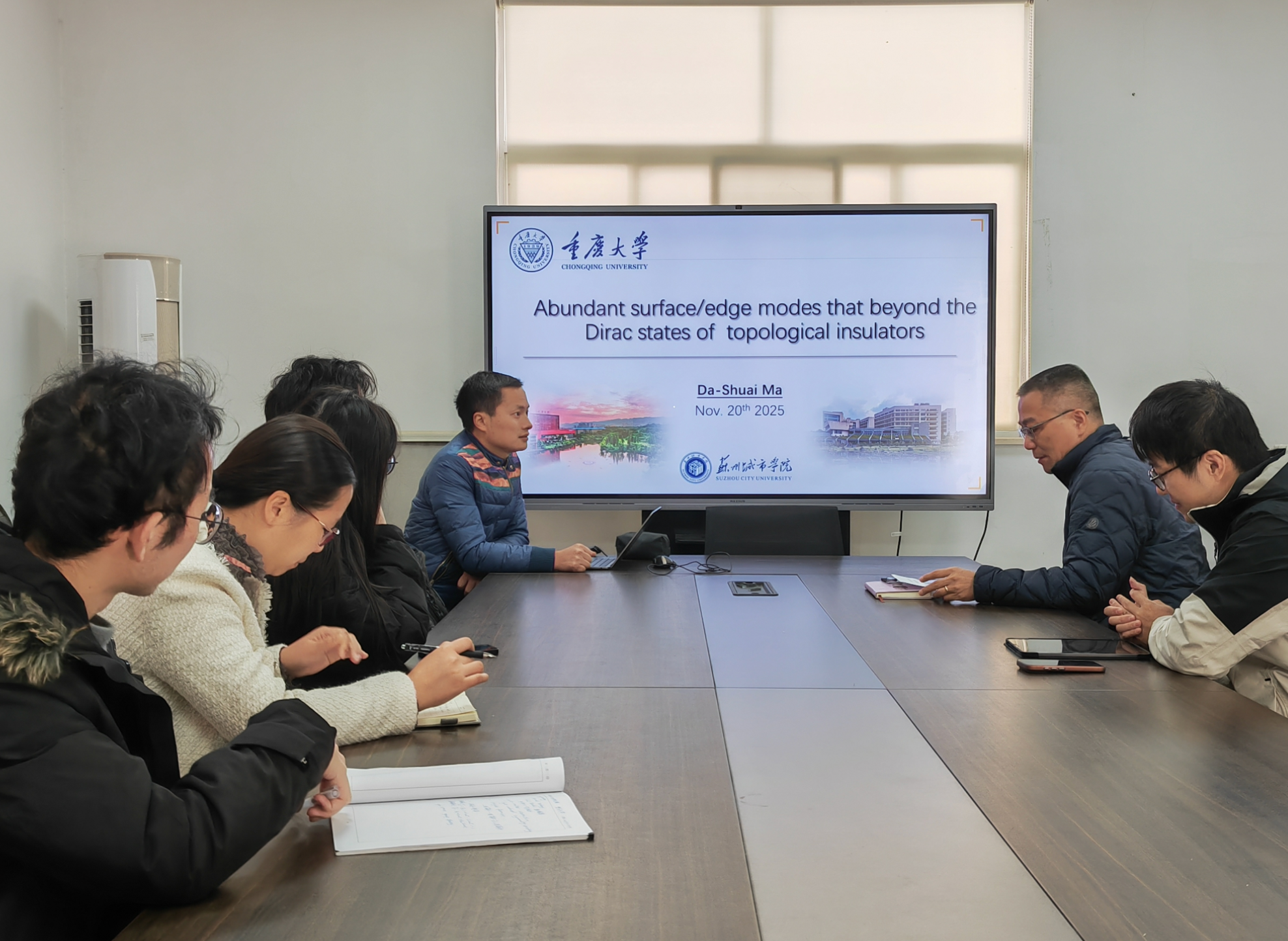 随着拓扑绝缘体领域研究的持续深化,探索超越传统狄拉克态的新型表面/边缘模式已成为国际自旋电子学领域的前沿热点方向。为帮助学院师生精准把握该领域研究动态、进一步提升科研创新能力,11月20日,重庆大学马大帅副教授受邀做客光电学院,带来题为“Abundant surface/edge modes that beyond the Dirac states of topological insulators”的高水平学术报告。报告由雎胜院长主持,学院相关专业教师与学生代表积极参与,共同聚焦拓扑材料领域的前沿突破。