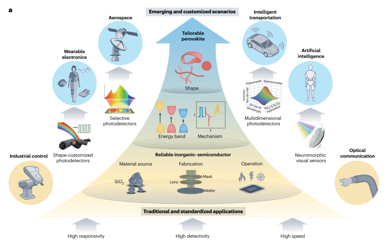 本文系统提出:钙钛矿材料依托“高定制潜力、低定制成本”的独特优势,可通过构建面向应用的定制化器件架构充分释放其材料潜能,进而在新兴定制化探测领域确立不可替代的地位。文章先总结了标准化钙钛矿探测器的发展进程,后重点梳理并展望了多类定制化钙钛矿探测器件,指出这些新范式有望在可穿戴、复杂场景识别、异构集成与智能视觉等需求牵引下形成差异化优势。与此同时,团队总结了走向定制应用与商业化仍需攻克的关键挑战,如稳定性与一致性提升、器件封装与可靠性评估体系、以及可制造工艺与规模化集成路径等。该综述强调了钙钛矿材料在新兴定制化探测中的关键且难以替代优势,并为钙钛矿探测器由“追求性能指标”向“以应用需求驱动的定制化”转型提供了明确路径。