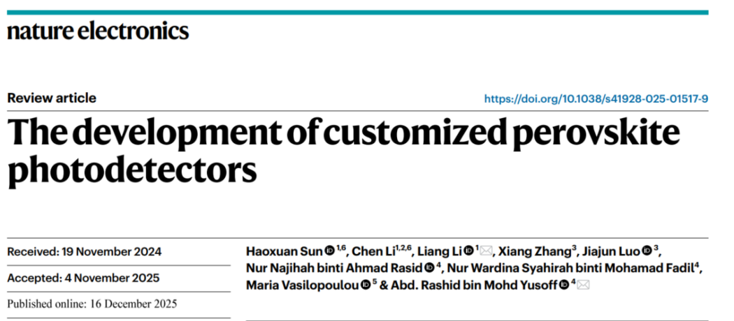近日,我校光学与电子信息学院李宸博士联合苏州大学李亮教授团队,马来西亚科技大学Rashid教授团队,系统梳理并展望面向特定应用的定制化钙钛矿光探测器发展路径与关键挑战。相关研究成果以“The development of customized perovskite photodetectors”为题,于2025年12月16日发表在国际权威期刊《Nature Electronics》(JCR-Q1,IF =40.9)。该项研究由苏州城市学院光学与电子信息学院为第二单位,李宸博士为该篇论文的共同第一作者。原文链接:https://www.nature.com/articles/s41928-025-01517-9