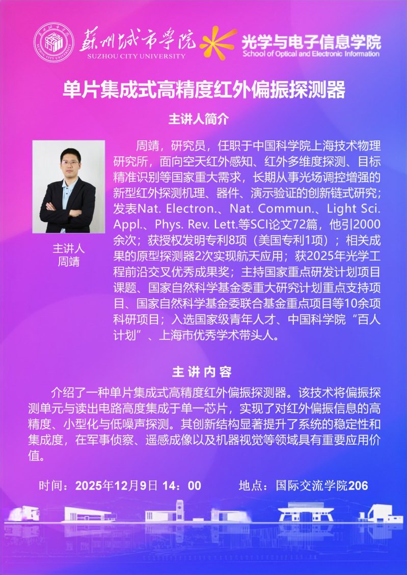 学术讲座——单片集成式高精度红外偏振探测器